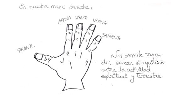 (La correspondencia de los pranas con los dedos de las manos está extraído de una fuente diferente a la del resto de contenidos. Me falta más información sobre ello, que no es fácil de encontrar; pero me ha parecido interesante incluirlo por el sentido que le da a la posición de las manos en los “mudras” que empleamos en las meditaciones o durante los Pranayamas).