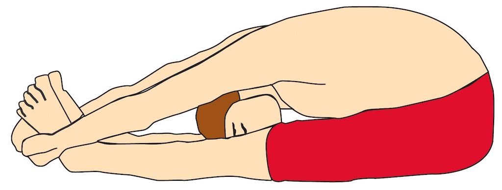 - Las manos deben apoyarse, si no llegamos a los pies utilizaremos un cinturón para enlazarlos e iremos avanzando por él a medida que avancemos en la postura, o nos conformaremos en apoyar las manos en la parte de las piernas donde lleguen con facilidad y sin engullir los hombros.