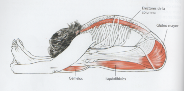 - Toda la parte posterior del cuerpo estirándola: bóveda plantar, soleo-gemelos, isquiotibiales, glúteos, músculos de la espalda y cuello.